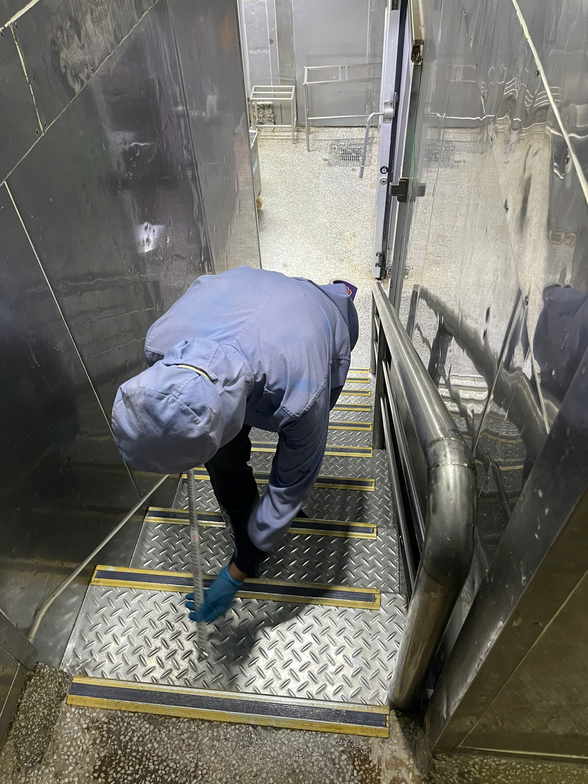 Dưới đây là hình ảnh nhà máy thực phẩm đã dùng nẹp kim loại chống trượt nhưng không hiệu quả vì dầu mỡ nhiều, chúng tôi đã phải xử lý lại bằng tấm chống trượt composite