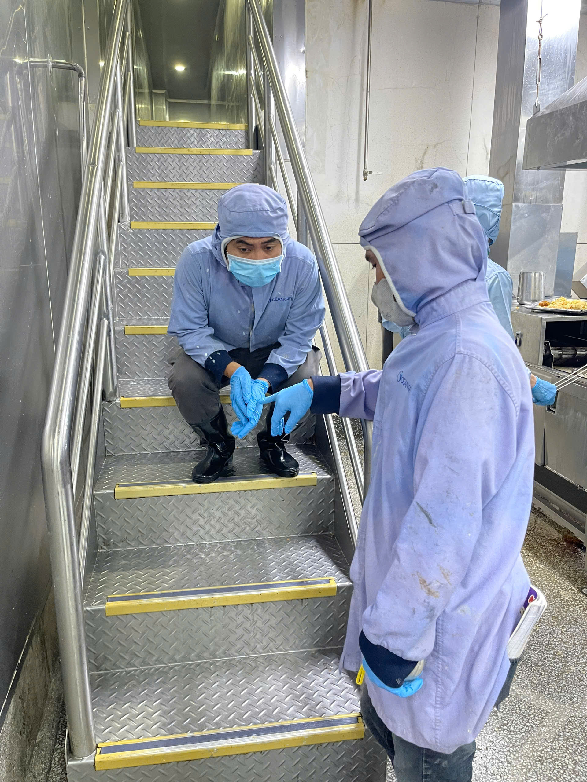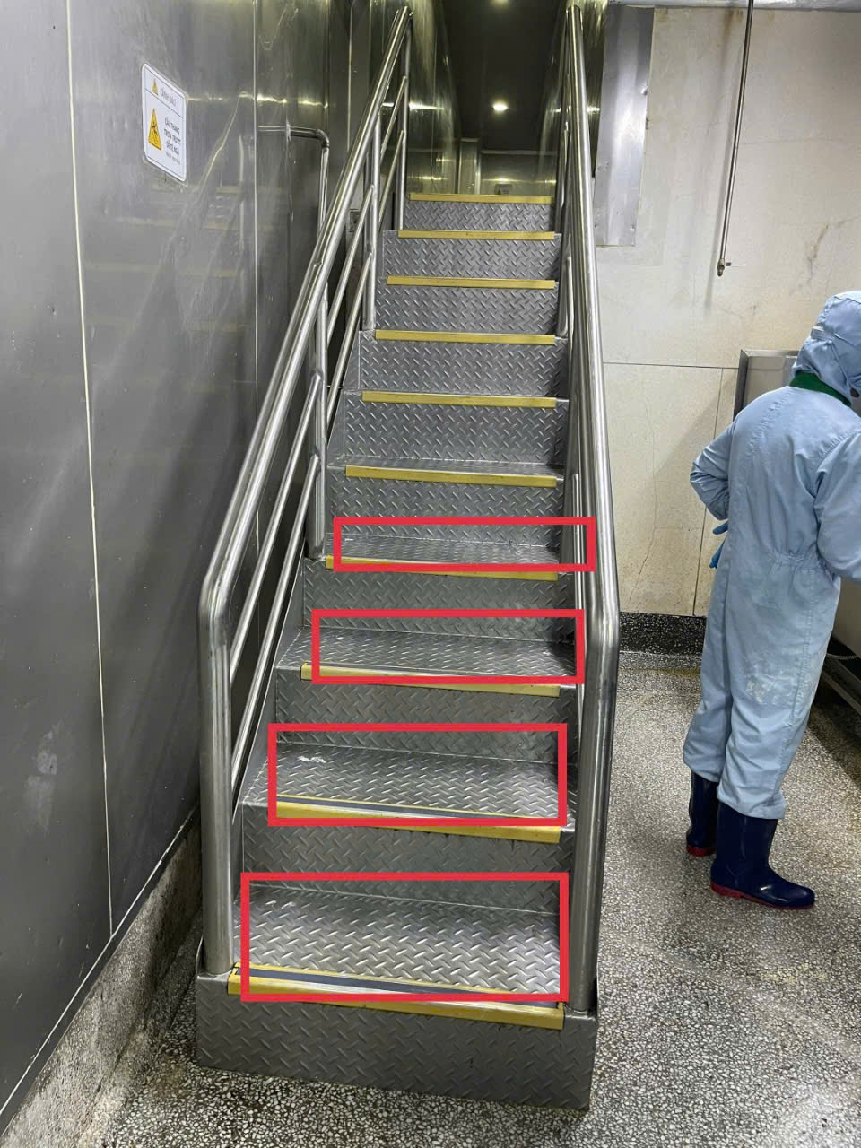 Dưới đây là hình ảnh nhà máy thực phẩm đã dùng nẹp kim loại chống trượt nhưng không hiệu quả vì dầu mỡ nhiều, chúng tôi đã phải xử lý lại bằng tấm chống trượt composite